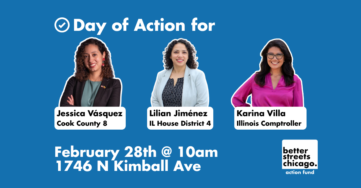 Join us for a Climate and Transit Day of Action for Jessica Vásquez (Cook County District 8), Lilian Jiménez (IL House District 4), and Karina Villa (IL Comptroller)!